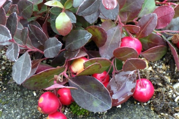 アメリカ北東部原産の常緑小低木、checkerberry、別名:オオミコウジ、チェッカーベリー